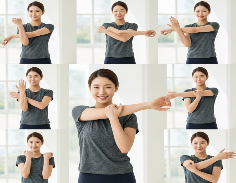 - 팔뚝 회전 스트레칭: 팔꿈치를 90도로 구부리고 옆구리에 붙입니다. 손바닥을 위로 향하게 한 후, 다른 손으로 손목을 잡고 바깥쪽으로 천천히 돌려줍니다. 반대로 손등을 위로 향하게 하고 안쪽으로 돌려줍니다.