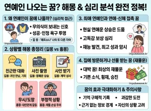[애정운] 연애하는 꿈해몽의 비밀: 무의식이 보내는 심리적 메시지와 상황별 의미 분석 BEST 5[성공운] 연예인 결혼식에 참여하는 꿈: 명예운과 신분 상승의 징조? 화려한 꿈 뒤에 숨은 심리[인생운] 신발 꿈의 모든 것: 신발 사는 꿈부터 잃어버리는 꿈까지, 당신의 지위와 새로운 시작의 예언