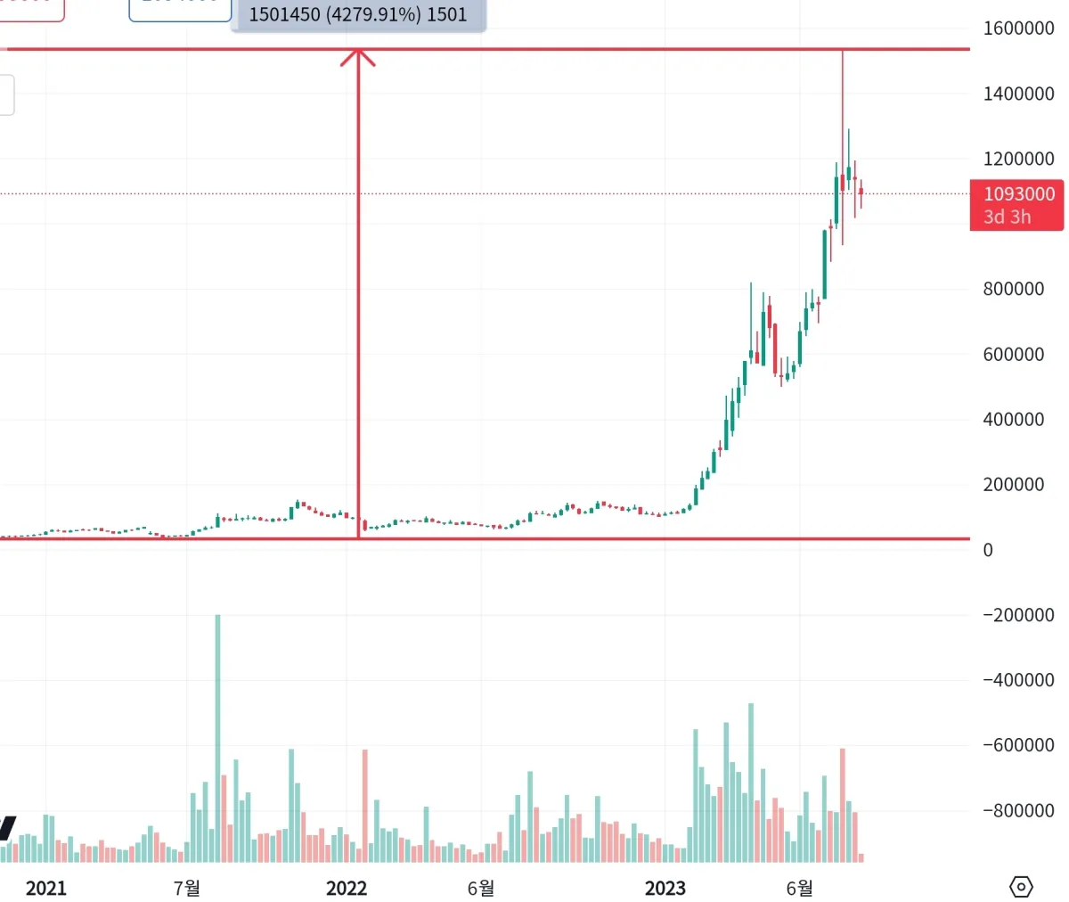 2021 ~ 2023 기간동안 주가는 4279 % 상승 했습니다.