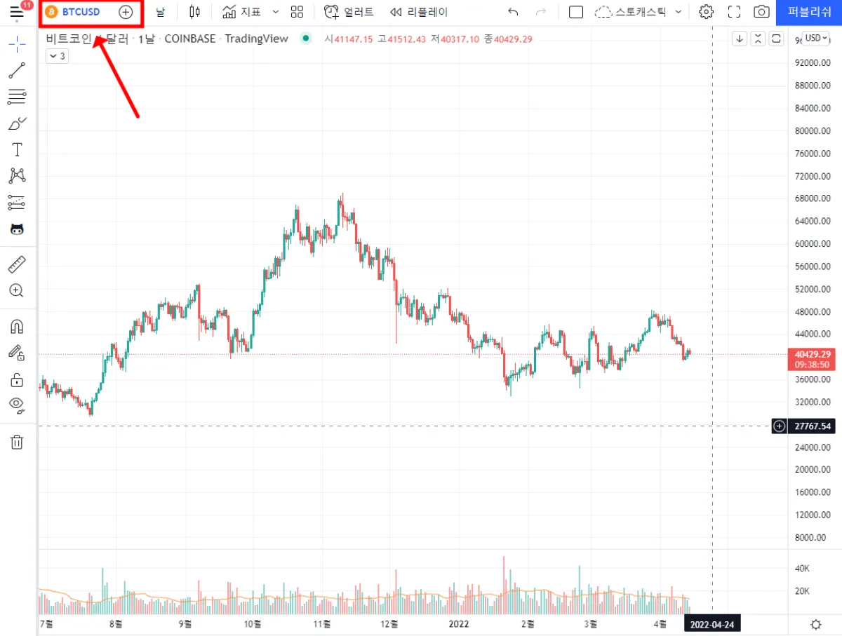 좌측 상단에 BTCUSD를 클릭합니다.