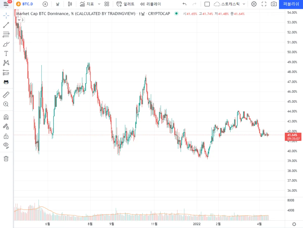 트레이딩뷰를 검색하시면 비트코인 도미넌스 차트를 확인할 수 있습니다.