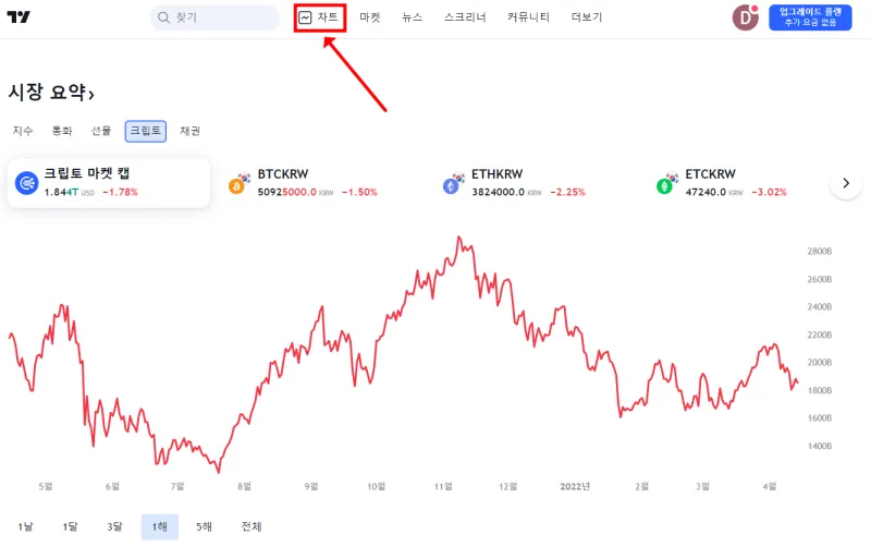 트레이딩뷰 사이트를 접속하시면 상단에 차트를 선택하세요.