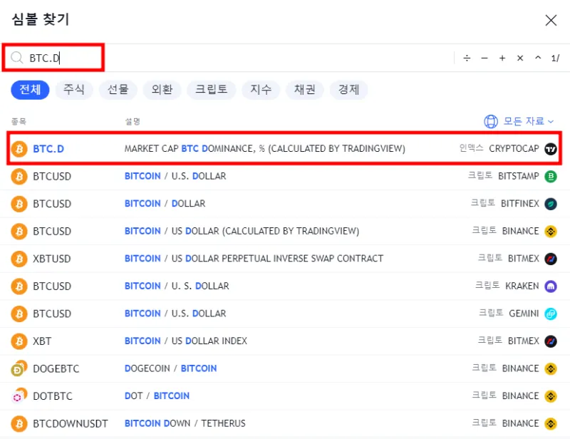 심볼 찾기 검색창이 나옵니다. 검색창에 "BTC.D"를 적어주시면 아래에 CRYPTOCAP_BTC.D가 검색이 됩니다.