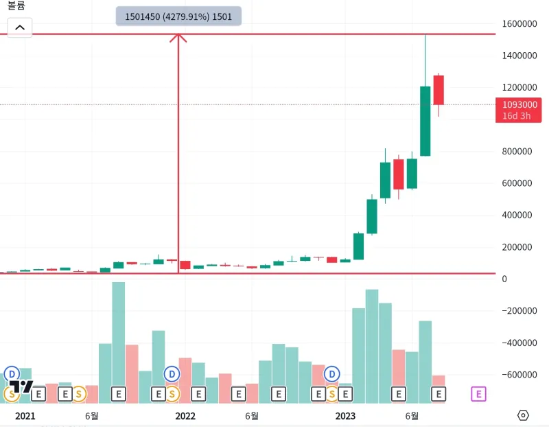 2021 ~ 2023 기간동안 주가는 4279 % 상승 했습니다.