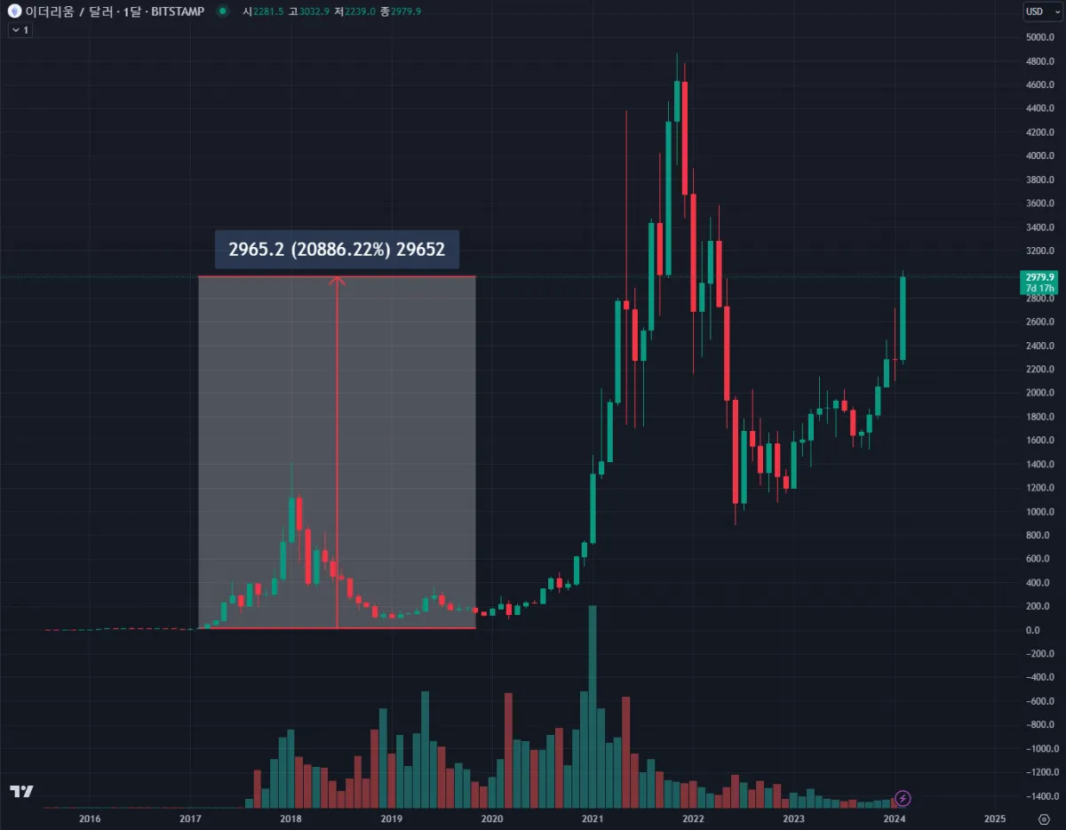 이더리움 월봉 차트를 보시면 장기 우상향중입니다.