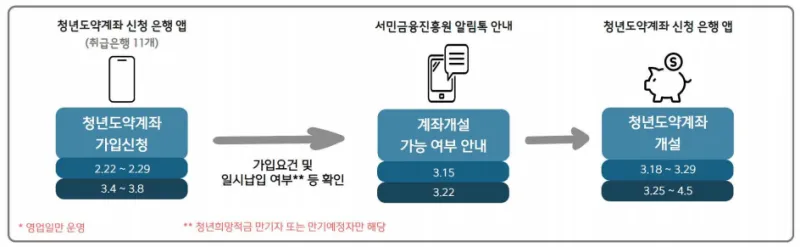 청년도약계좌는 매월 협약은행 앱으로 가입신청을 받은 후 가입요건과 확인 절차를 거쳐서 계좌를 개설할 수 있게 운영중입니다