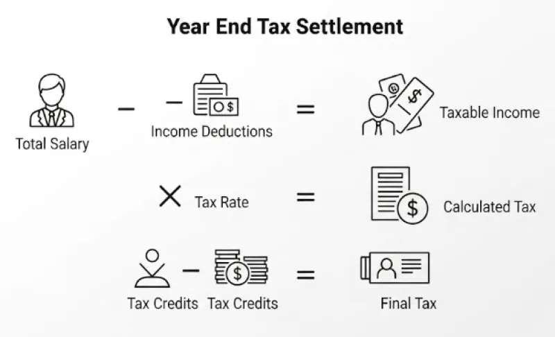 연말정산이란, 회사가 매월 월급에서 미리 떼어간 세금(원천징수세액)이, 내가 실제로 1년 동안 내야 할 세금(결정세액)보다 많은지 적은지 정산하는 절차입니다. 정산 결과에 따라 세금을 더 냈으면 돌려받고(환급), 덜 냈으면 추가로 납부하게 됩니다.
