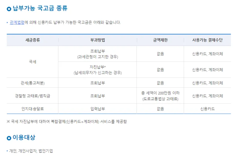 - 카드로택스를 이용하여 납부할 수 있는 세금은 국세, 지방세, 고지서가 발급되는 세금입니다.