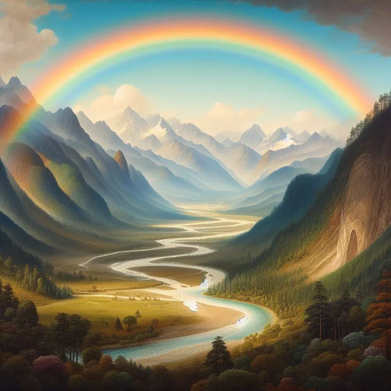 무지개와 계곡이 있는 자연 풍경