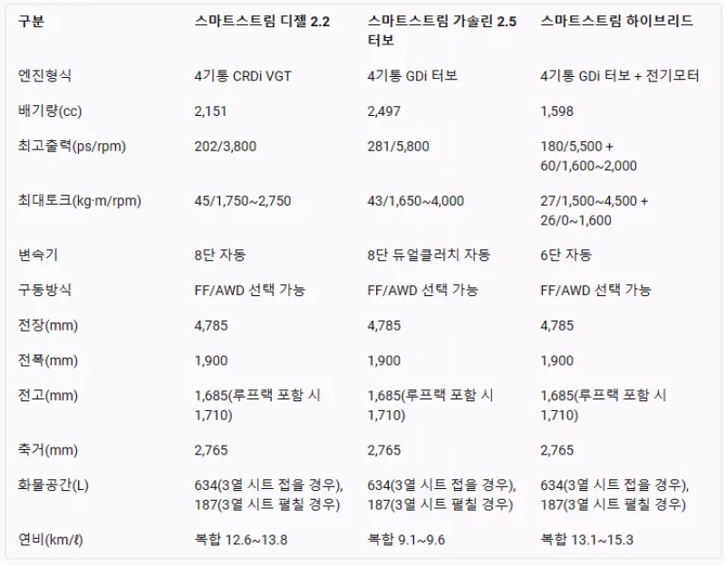 스마트스트림 디젤 2.2 엔진은 202마력의 최고출력과 45kg·m의 최대토크를 발휘하며, 8단 자동 변속기와 결합하여 부드러운 가속과 감속을 제공합니다. 스마트스트림 가솔린 2.5 터보 엔진은 281마력의 최고출력과 43kg·m의 최대토크를 자랑하며, 8단 듀얼클러치 자동 변속기와 함께 빠른 변속과 반응성을 갖추었습니다.