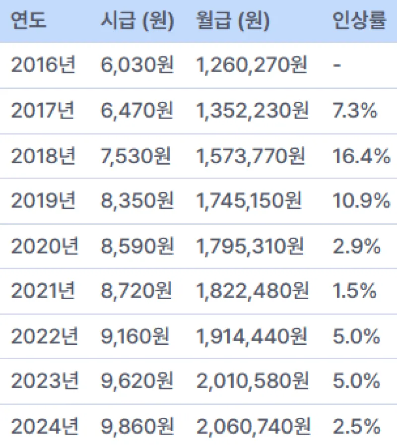 표를 통해 최근 몇 년간 한국의 시급 및 월급 변동 추이를 확인할 수 있습니다.