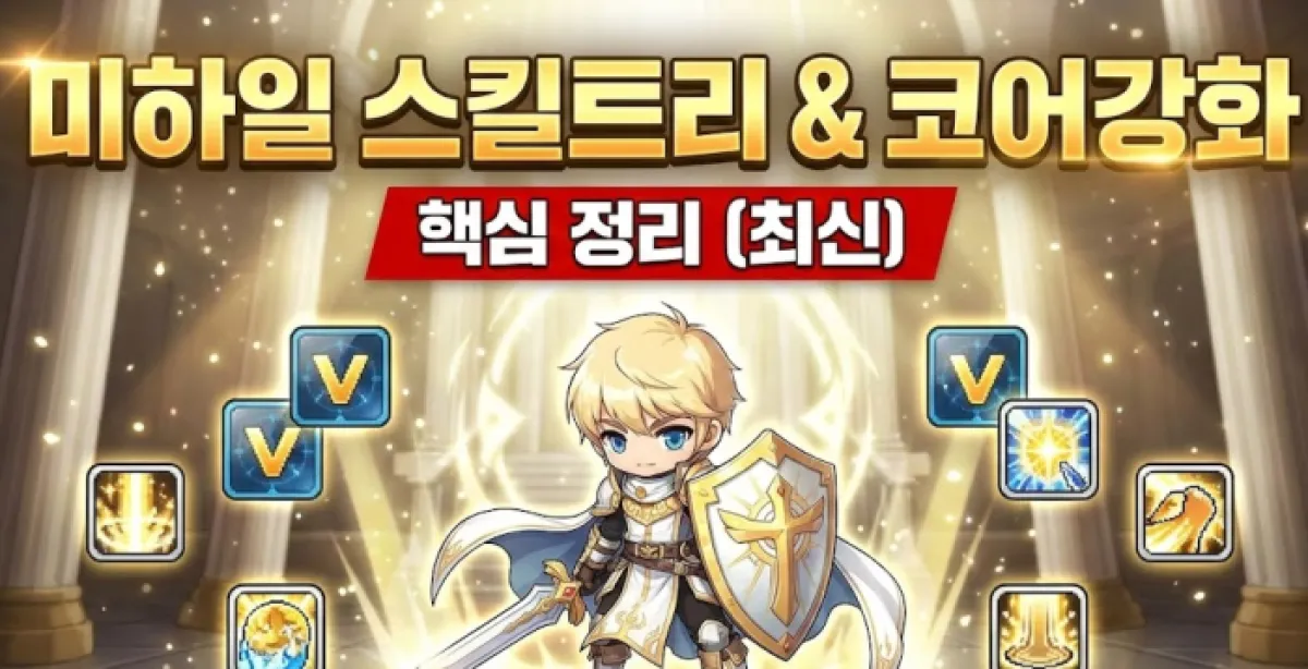 5차 전직 이후 미하일의 진정한 강력함이 드러나는데요, 코어 강화(코강)는 복잡해 보이지만 핵심만 알면 정말 간단해요. 미하일은 강화해야 할 스킬 개수가 적어서 '코강 혜자' 직업 중 하나랍니다.