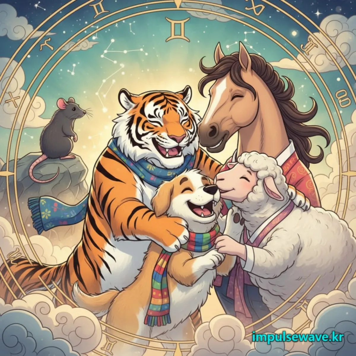 범띠(호랑이)는 나무(木)의 성질을 가지고 있어 불(火)인 말띠에게 땔감이 되어줍니다. 서로 시너지가 폭발하는 관계죠. 개띠는 불을 품은 흙(土)으로, 말띠의 뜨거운 열기를 안정적으로 받아주어 재물운을 지켜주는 역할을 합니다.