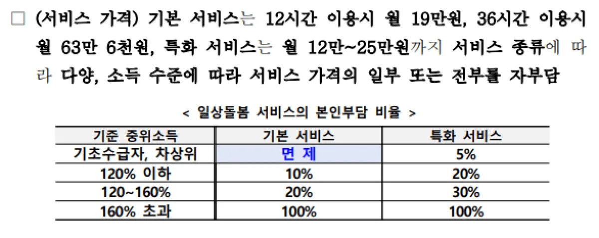 서비스는 하반기부터 시작되며, 소득 수준보다는 서비스 필요에 따라 서비스를 이용할 수 있도록 하고 차등화된 본인부담을 내고 서비스를 이용할 수 있습니다.