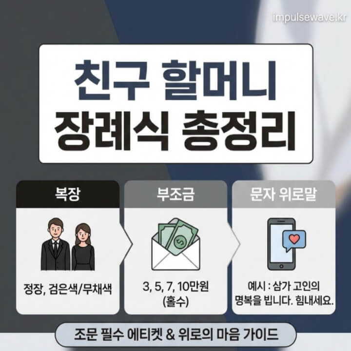 상황별 적정 부조금 액수(3, 5, 10만 원의 법칙)부터, 급할 때 입고 가도 되는 현실적인 복장 가이드, 그리고 친구의 마음을 울리는 위로 문자(조문 메시지) 예시까지 상세하게 정리해 드립니다.