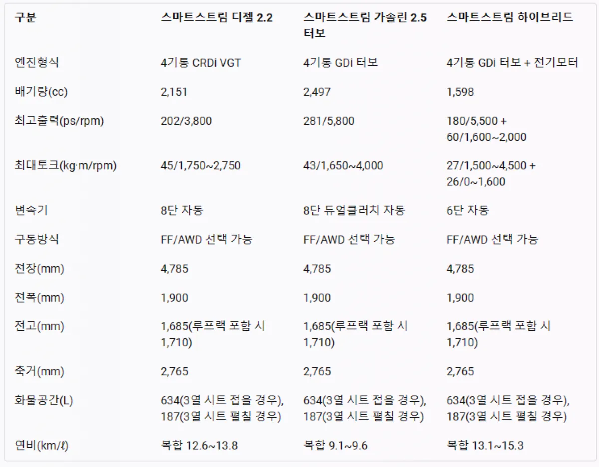 스마트스트림 디젤 2.2 엔진은 202마력의 최고출력과 45kg·m의 최대토크를 발휘하며, 8단 자동 변속기와 결합하여 부드러운 가속과 감속을 제공합니다. 스마트스트림 가솔린 2.5 터보 엔진은 281마력의 최고출력과 43kg·m의 최대토크를 자랑하며, 8단 듀얼클러치 자동 변속기와 함께 빠른 변속과 반응성을 갖추었습니다.