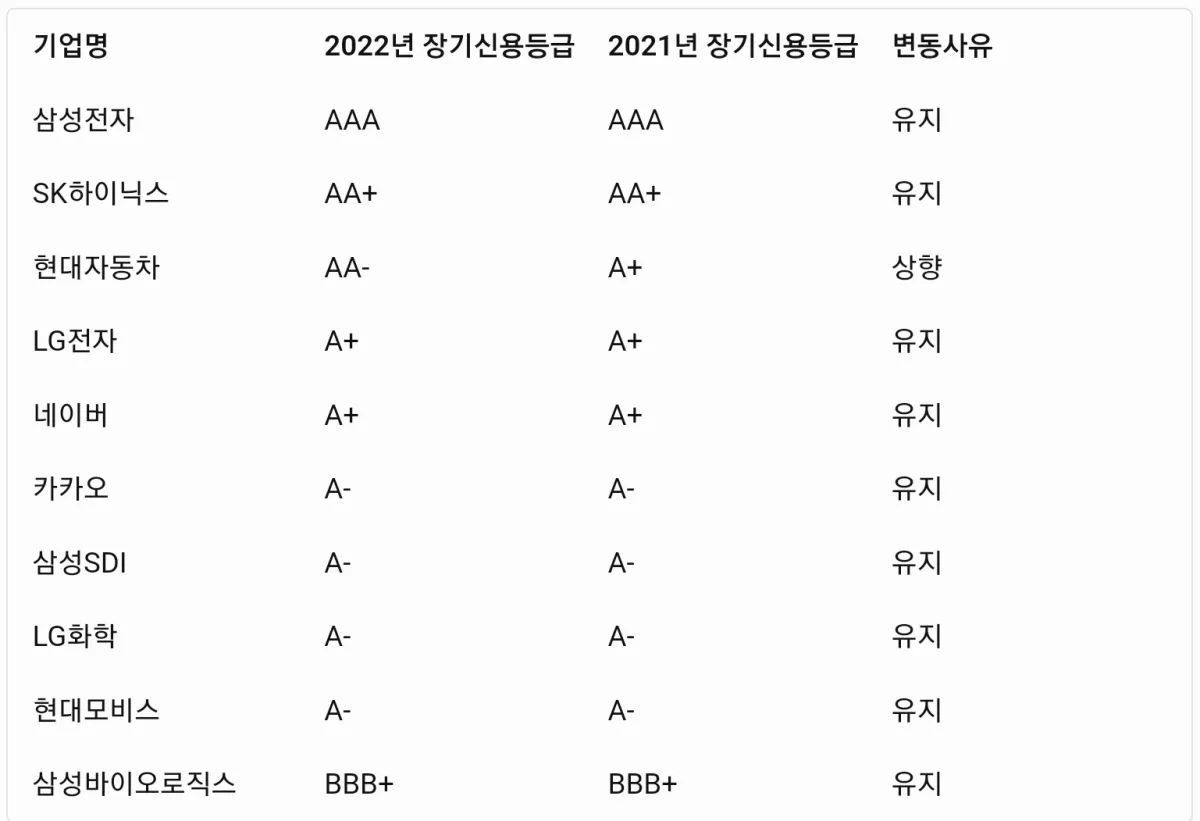 위의 표에서 볼 수 있듯이, 2022년에는 현대자동차가 장기신용등급을 한 단계 상향 조정 받았습니다.