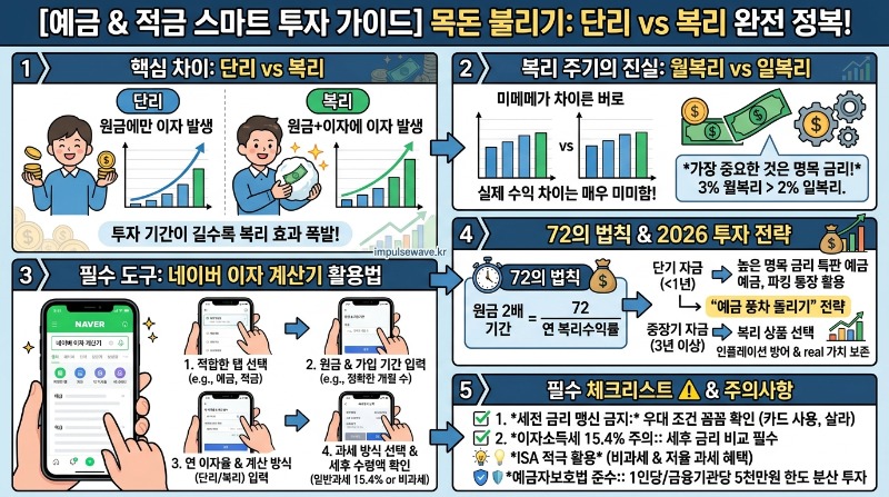 2026년 현재 금융 시장은 글로벌 경제의 불확실성과 금리 변동성이 그 어느 때보다 커진 상황이에요. 따라서 무조건 장기 복리 상품에 돈을 묶어두기보다는, 자금의 목적과 사용 시기에 맞춰 포트폴리오를 다변화하는 전략이 필요해요. 단리 복리 차이, 이자계산기 사용법, 월복리 일복리 [출처] 단리 복리 차이, 이자계산, 월복리 일복리 개념을 완벽히 숙지하고 있다면, 어떤 상품을 조합하는 것이 최적의 효율을 내는지 스스로 판단할 수 있는 안목이 생기게 됩니다.