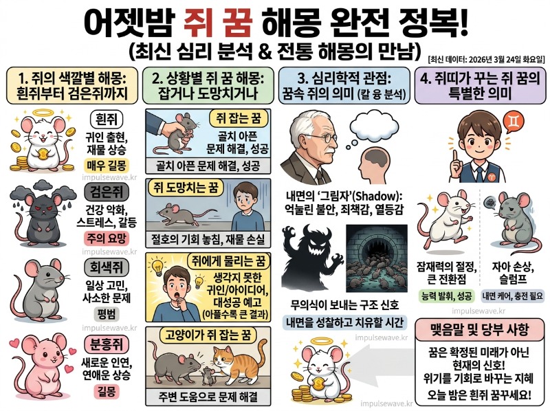 어젯밤 꿈에 갑자기 쥐가 나타나서 깜짝 놀라셨나요? 쥐 꿈은 상황에 따라 엄청난 재물운을 가져다주는 길몽이 되기도 하지만, 반대로 건강이나 인간관계의 적신호를 알리는 흉몽이 될 수도 있어요. 오늘 이 글에서는 2026년 3월 24일 화요일 최신 심리학적 데이터와 전통 해몽을 교차 검증하여, 쥐가 나타나는 꿈의 상징적 의미부터 심층적인 심리 분석까지 여러분의 궁금증을 완벽하게 해결해 드릴게요.