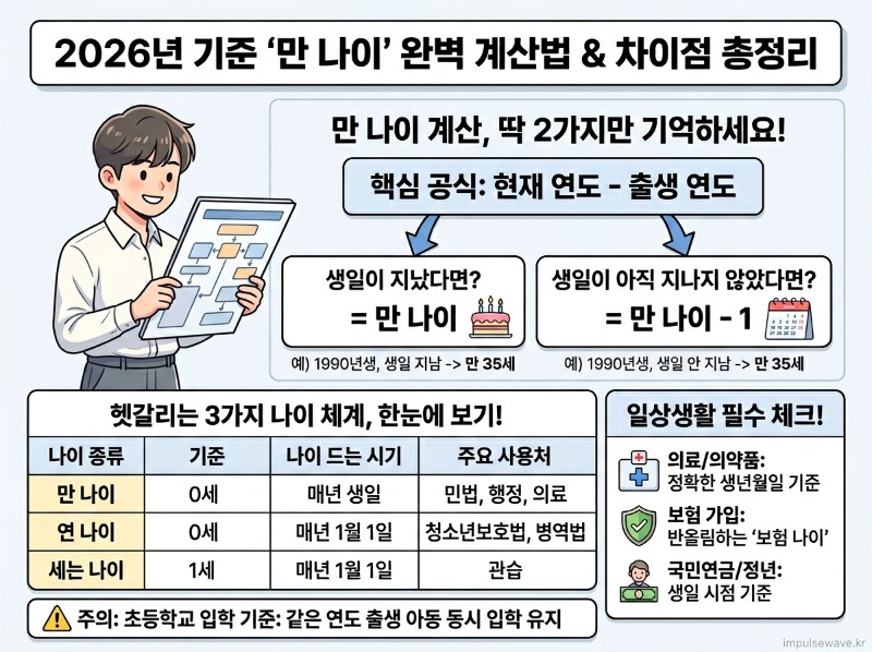 매년 해가 바뀔 때마다 내 나이가 정확히 몇 살인지 헷갈리셨던 경험, 다들 한 번쯤 있으실 거예요. 특히 행정 기준이 바뀌면서 일상생활에서 어떤 나이를 써야 할지 혼란을 겪는 분들이 여전히 많습니다. 오늘은 2026년 만나이 계산법 어떻게 계산할까 세는나이 차이에 대해 완벽하게 정리해 드릴 테니, 이 글 하나만 끝까지 읽어보시면 모든 궁금증이 해결되실 거예요!