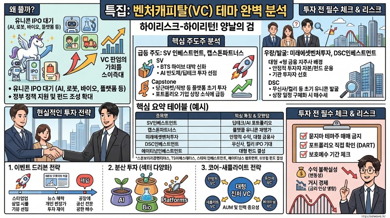 이벤트 드리븐 전략이란, 특정 이벤트(예: 대형 유니콘 기업의 상장 심사 청구, 정부의 대규모 벤처 펀드 조성 발표 등)가 발생하기 전 미리 길목을 지키고 선취매하는 방식을 말해요. 뉴스가 대대적으로 보도되고 대중의 관심이 쏠려 주가가 급등했을 때는 오히려 분할 매도로 수익을 챙기는 것이 정석적인 플레이이자 가장 안전한 매매법이라고 할 수 있어요.