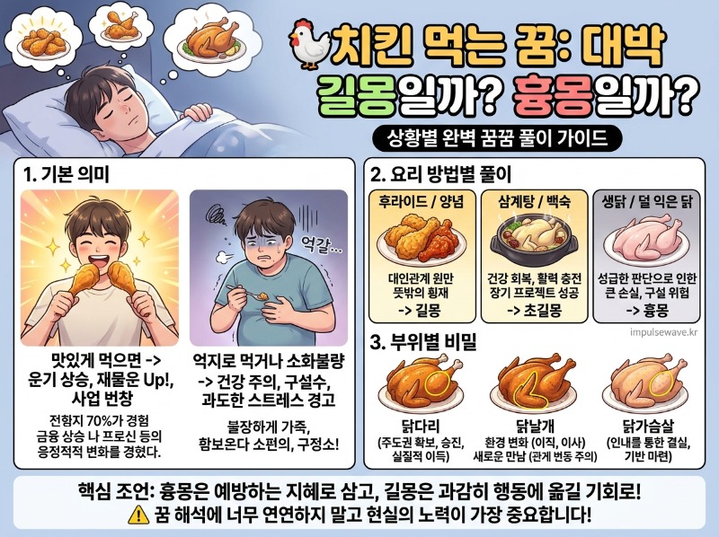 밤새 고소하고 맛있는 냄새에 이끌려 잠에서 깨어난 적이 있으신가요? 꿈속에서 등장하는 음식은 우리의 무의식이 보내는 강력한 메시지일 확률이 매우 높으며, 특히 한국인의 소울푸드인 치킨과 닭고기를 먹는 꿈은 상황에 따라 엄청난 재물운을 상징하기도 하지만 때로는 건강상의 치명적인 경고를 암시하기도 한답니다. 오늘 이 시간을 통해 여러분이 꾸신 꿈이 과연 대박을 부르는 길몽인지, 아니면 조심해야 할 흉몽인지 아주 깊이 있게 파헤쳐 드릴게요.
