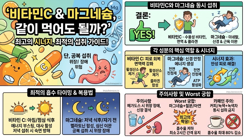 결론부터 명확하게 말씀드릴게요. 두 성분은 함께 섭취해도 체내에서 서로의 흡수를 방해하거나 충돌하지 않아요. 오히려 각자의 위치에서 독립적으로 긍정적인 작용을 하기 때문에 안심하고 드셔도 된답니다. 비타민 C는 영양제 생태계에서 이른바 '무자본 필수 1티어'로 불릴 만큼 가성비가 뛰어나고 접근성이 좋은 수용성 속성을 가지고 있으며, 마그네슘은 미네랄 속성을 띠고 있습니다.