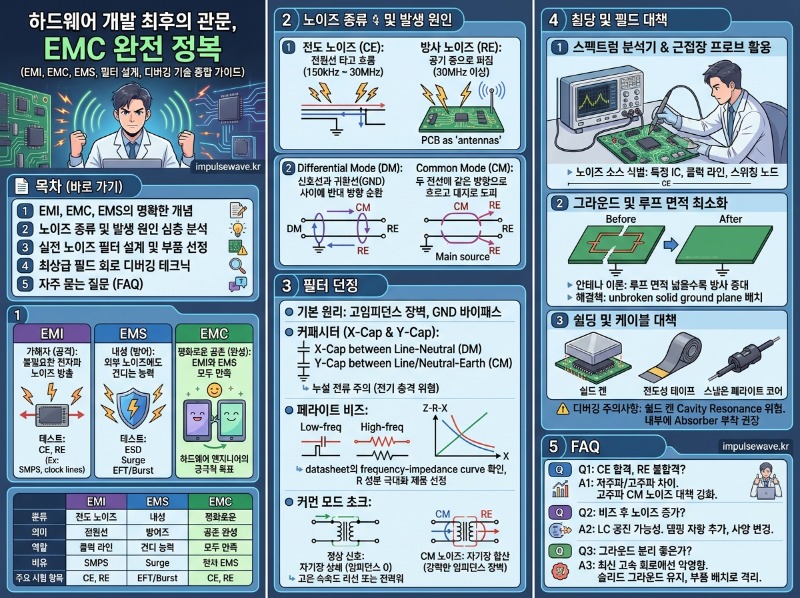 하드웨어 개발의 마지막 관문인 전자파 인증 시험소에서 좌절을 겪어보신 적이 있으신가요? 수차례의 PCB 재설계와 막대한 인증 실패 비용은 전체 프로젝트 일정에 치명적인 타격을 주게 됩니다. 오늘은 현업 엔지니어들을 위해 EMI, EMC, EMS의 정확한 개념부터 실전 노이즈 필터 설계 및 회로 디버깅 기술까지 완벽하게 정리해 드릴게요.