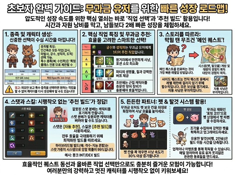 물론 '나는 무조건 귀여운 고양이 외형이 좋다'라며 외형적 만족감을 우선시하는 반론이 있을 수 있어요. 하지만 장기적인 파티 플레이와 다양한 직업 경험을 원하신다면, 범용성이 뛰어난 인간형으로 시작하는 것이 훨씬 안정적인 성장 기반을 마련해 줍니다.