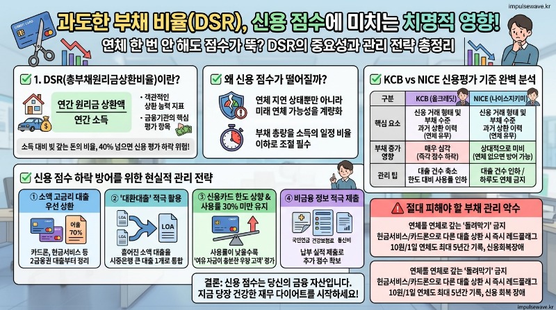 결론적으로, 신용점수를 방어하고 높이기 위해서는 단순히 연체를 피하는 것을 넘어, 전체적인 부채의 규모를 소득의 일정 비율 이하로 통제하는 전략이 반드시 필요합니다.