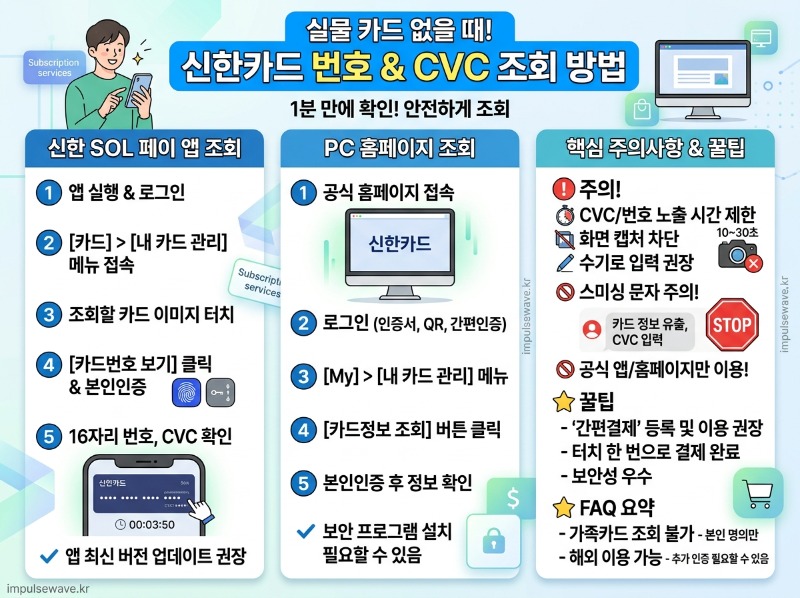 지갑을 두고 외출했는데 갑자기 온라인 결제가 필요한 난감한 상황, 다들 한 번쯤 겪어보셨을 거예요. 당장 결제를 마쳐야 하는데 실물 카드가 없어 당황스럽다면 오늘 안내해 드리는 내용이 큰 도움이 될 텐데요. 신한카드의 공식 플랫폼인 신한 쏠페이 앱을 활용하면 단 1분 만에 카드 정보를 안전하게 확인할 수 있는 방법을 상세히 분석해 드릴게요.