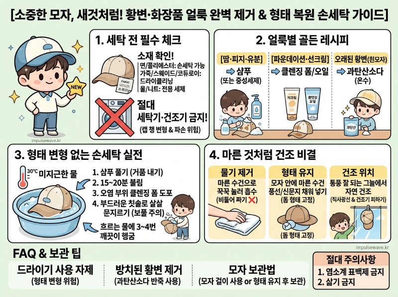 아끼는 모자에 누렇게 밴 땀 자국과 파운데이션 얼룩 때문에 속상하셨던 적 있으신가요? 무작정 세탁기에 돌렸다가 챙이 망가져서 버리게 되는 참사가 종종 발생하곤 하죠. 오늘은 집에서도 형태 변형 없이 새것처럼 깨끗하게 복원하는 완벽한 세탁 공식을 알려드릴게요.