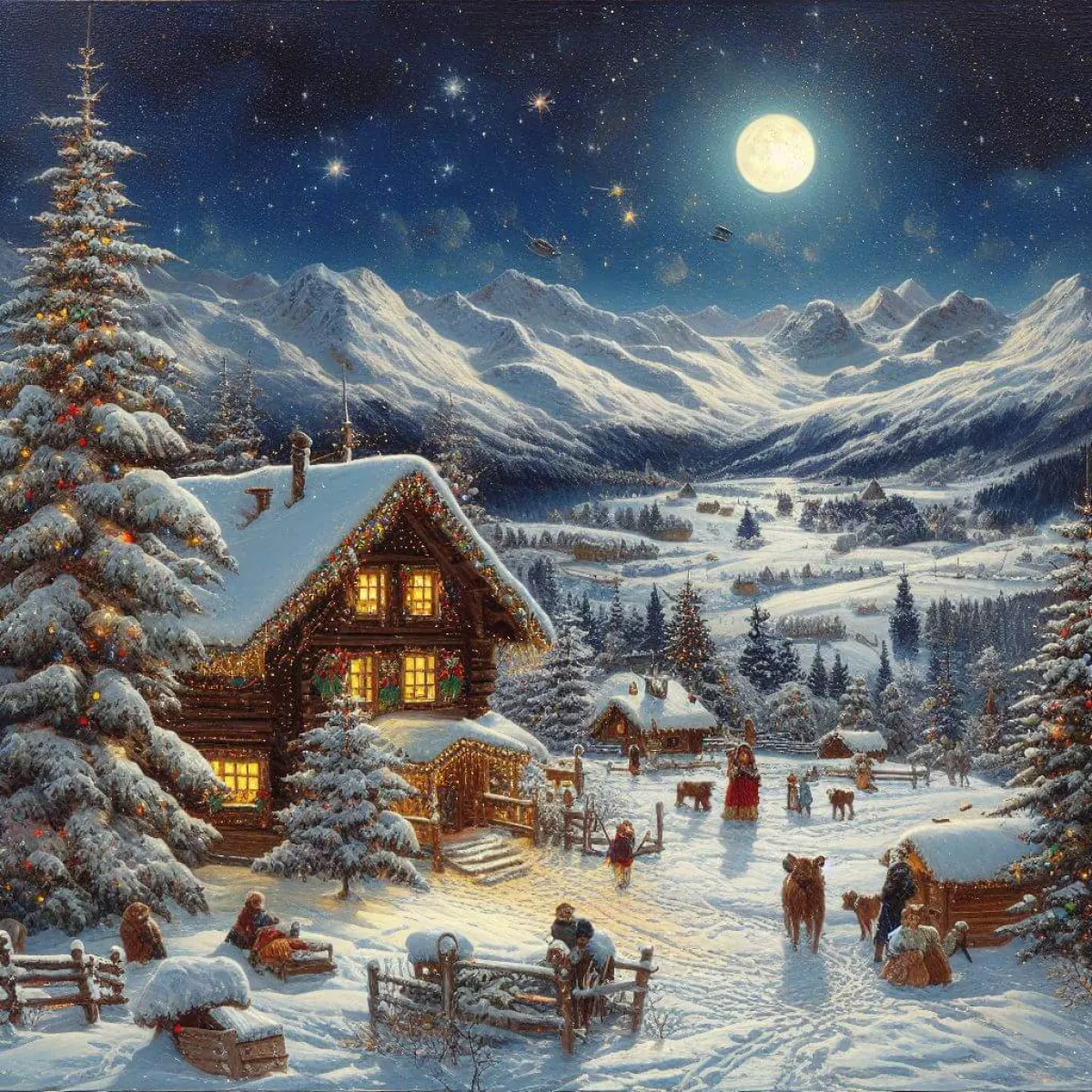 이 그림은 겨울밤의 풍경과 행복을 아름답게 그려낸 작품입니다. 목조집과 평화로운 자연이 편안함과 따뜻함을 전달합니다.
