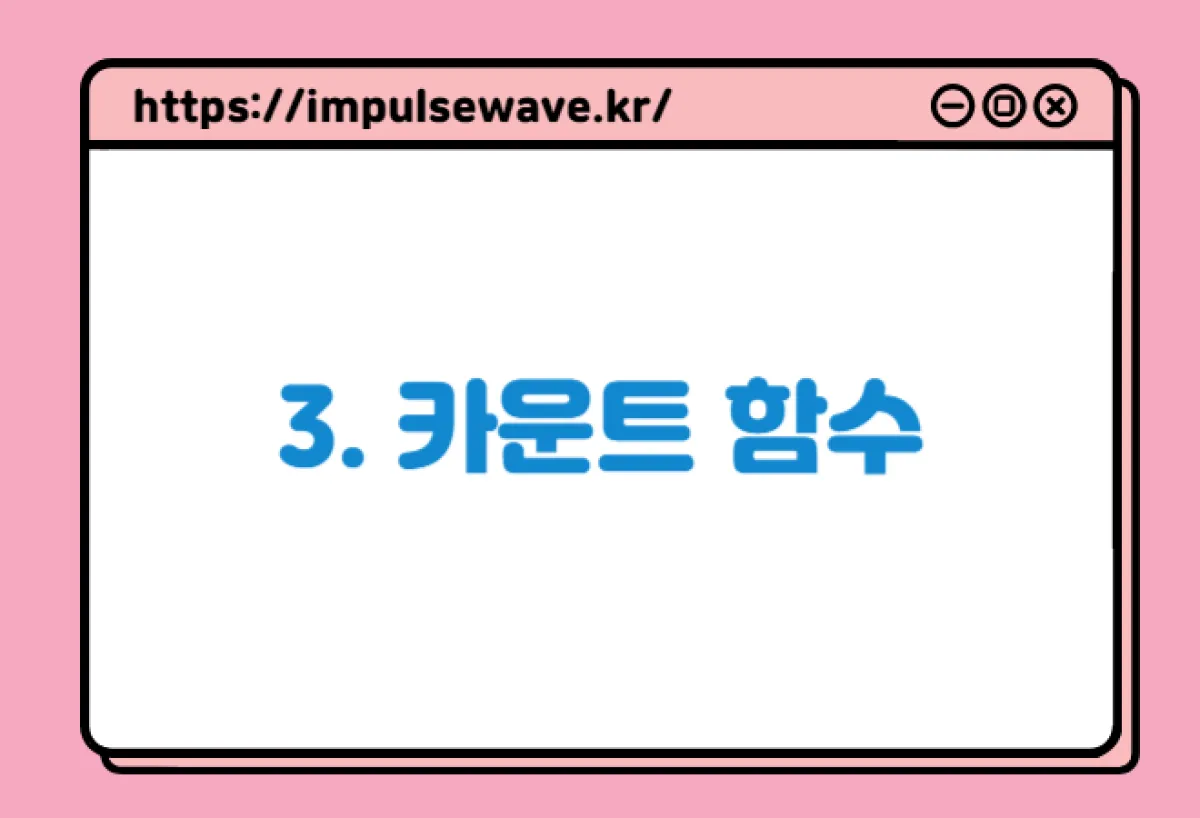 카운트 함수는 셀 범위의 개수를 세는 함수입니다. 카운트 함수에는 COUNT, COUNTA, COUNTIF, COUNTIFS, COUNTBLANK 등이 있습니다. 카운트 함수는 셀 범위의 전체 개수나, 특정 조건을 만족하는 개수나, 비어있는 개수 등을 구할 수 있습니다. 카운트 함수의 예제는 다음과 같습니다.