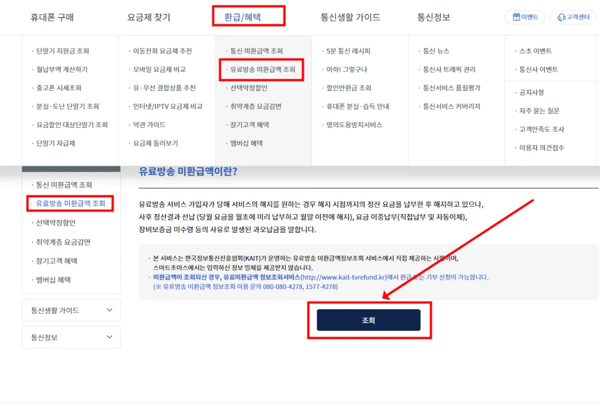 - 과거 3년간의 유료방송 이용 내역 및 미환급금 확인 가능