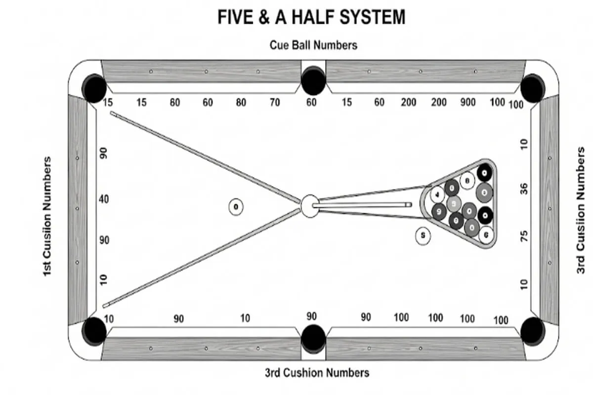 - 당점 (English/Spin): 파이브 앤 하프 시스템은 기본적으로 약간의 회전(2~3팁 정도의 사이드 스핀)을 준 것을 기준으로 합니다. 회전량에 따라 각도가 달라지므로 일정한 당점을 주는 연습이 필요합니다.