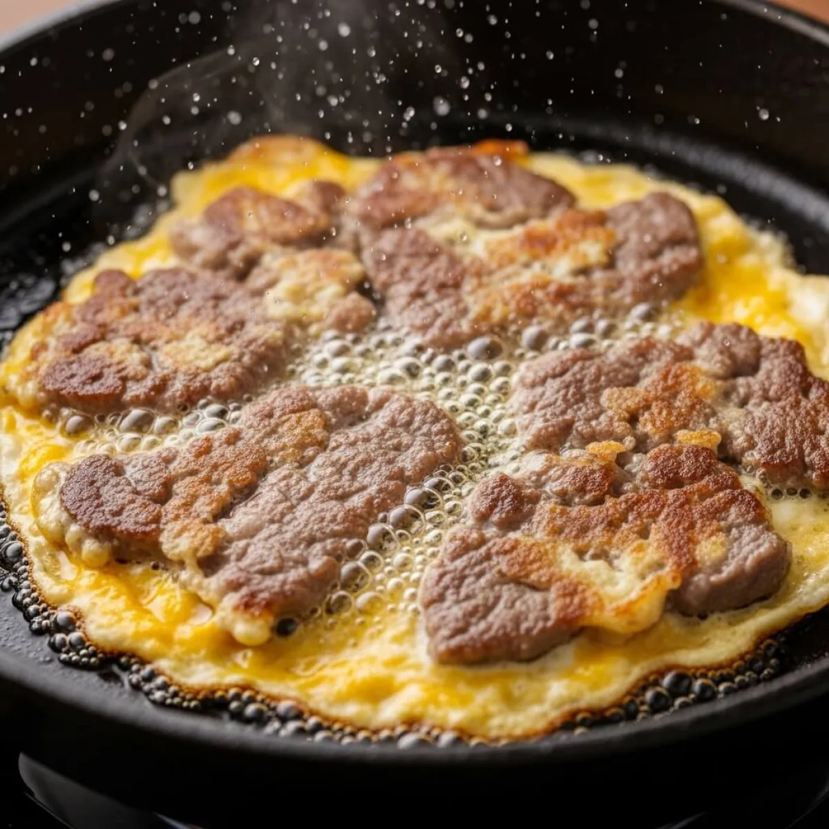 계란옷 입힌 고기를 올린 뒤 앞뒤로 딱 30초씩만 부쳐주세요.