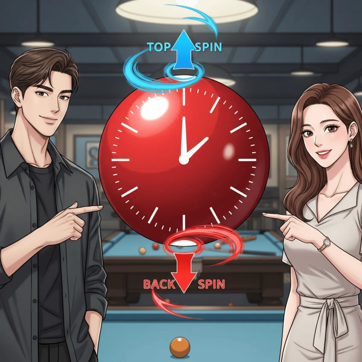 이제 진짜 비밀 기술인 '당점(Tip)' 이야기로 들어가 볼까요? 당구공을 시계라고 생각해보세요. 12시 방향(상단)을 치면 공은 전진 회전(오시)을 먹어 앞으로 계속 굴러가려 합니다. 반대로 6시 방향(하단)을 치면 역회전(히끼/시라)이 걸려 맞고 나서 뒤로 오거나 멈추게 되죠.